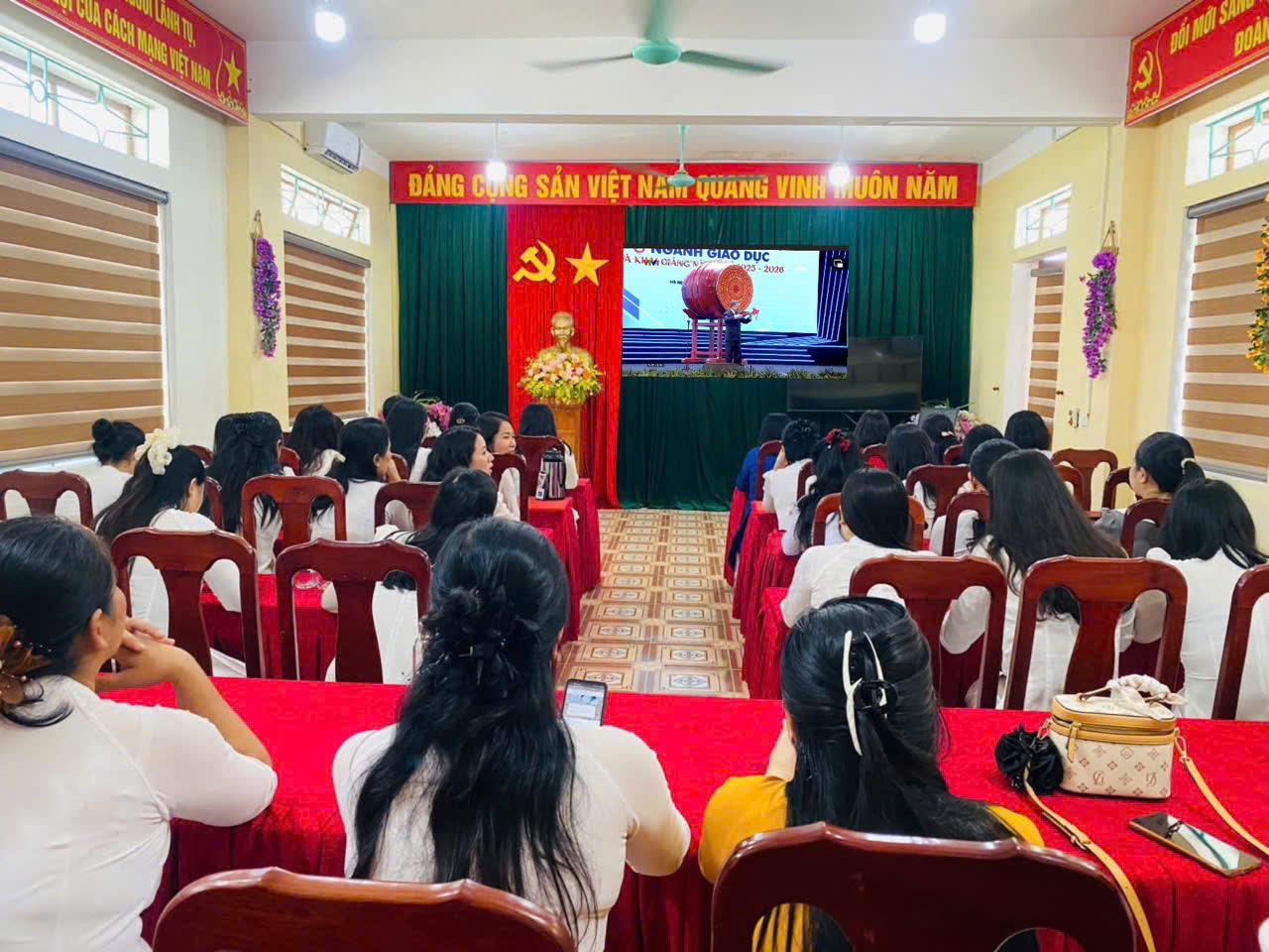 Ngay sau phần hội, đội ngũ cán bộ giáo viên, nhân viên nhà trường đã kết nối trực tuyến nơi diễn ra Lễ kỷ niệm 80 năm thành lập Bộ Quốc gia Giáo dục và khai giảng năm học mới theo Kế hoạch số 1153/KH-BGDĐT ngày 08/8/2025. Trong không khí trang nghiêm, đồng chí Tô Lâm - Ủy viên Bộ Chính trị, Tổng Bí thư Trung ương Đảng trịnh trọng đánh trống khai giảng năm học mới, chính thức vang lên hồi trống thiêng liêng mở đầu năm học 2025 - 2026 trên khắp mọi miền Tổ quốc. Tổng Bí thư đã nhấn mạnh: “Giáo dục phải là quốc sách hàng đầu, phải nuôi dưỡng tinh thần hiếu học, sáng tạo của thế hệ trẻ, xây dựng một nền giáo dục nhân văn, chất lượng và hội nhập”. Những lời căn dặn ấy là định hướng, cũng là niềm tin để ngành giáo dục bước vào năm học mới với quyết tâm cao nhất.