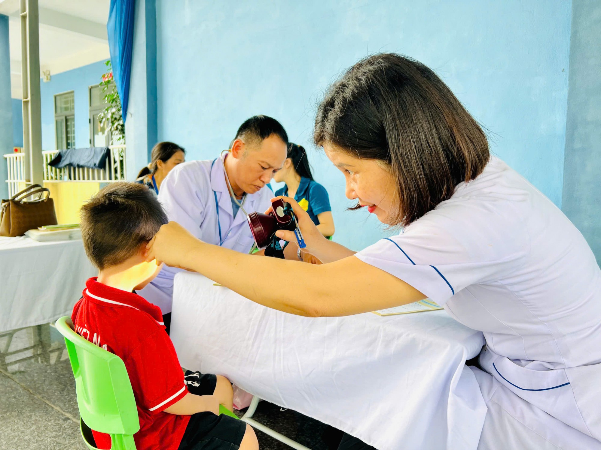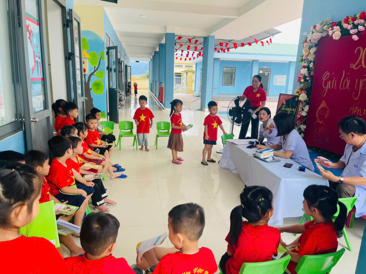 Buổi khám diễn ra nghiêm túc, chu đáo. Các cháu được cô giáo hướng dẫn xếp hàng ngay ngắn, trò chuyện thân mật cùng bác sĩ, tạo nên không khí vui vẻ, gần gũi.